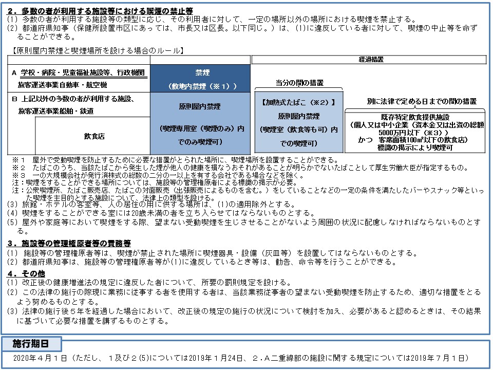 2018年7月に健康増進法の一部を改正する法律が成立し、2020年4月1日より全面施行されます。