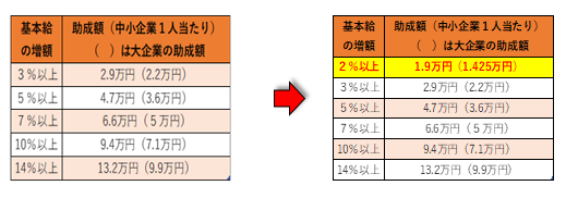 ・被用者保険加入とともに基本給の増額を行う場合の助成メニューについては、複数回支給を可能とし下表の通り2%以上の増額も対象にする。