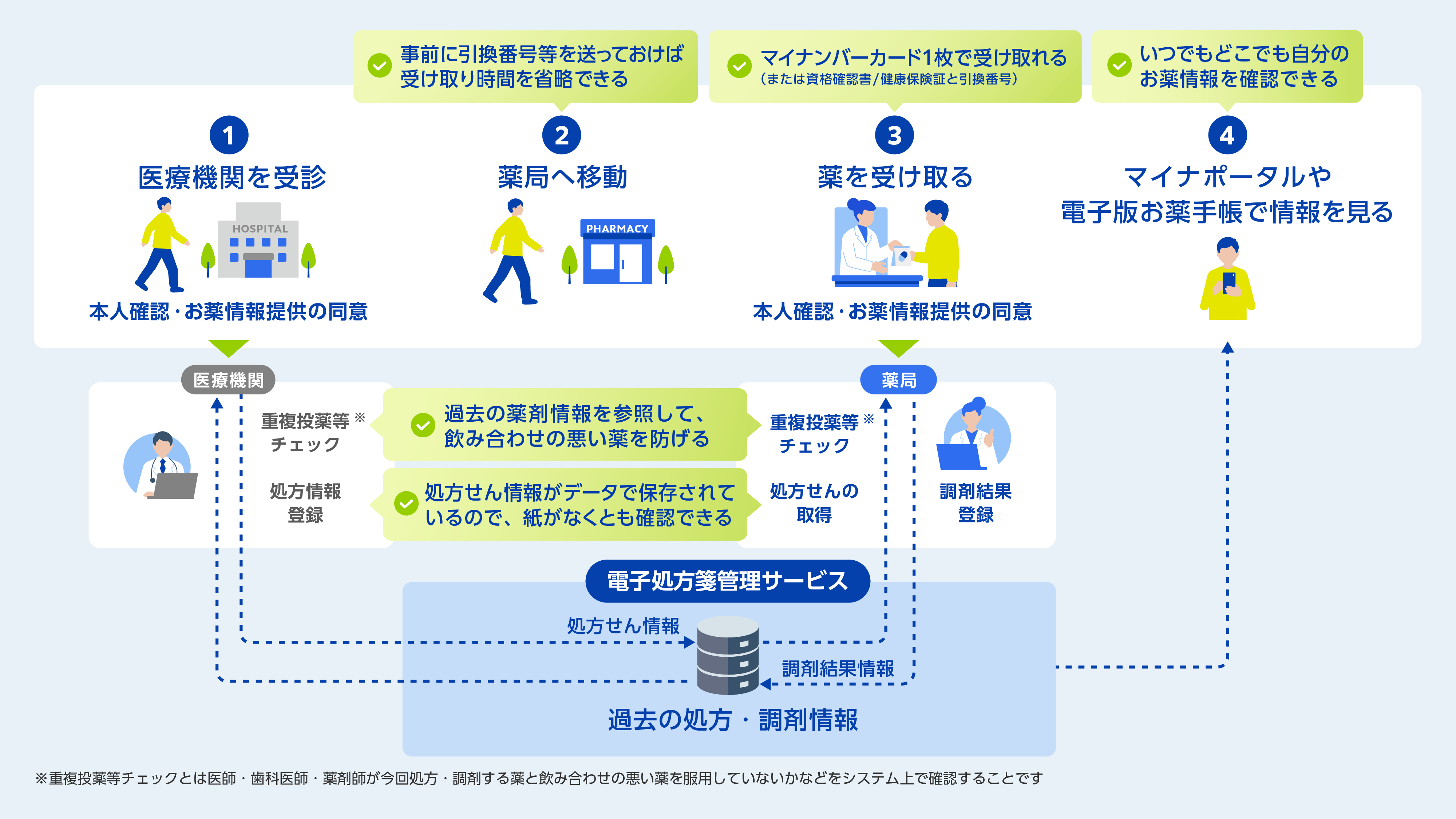 医師・歯科医師・薬剤師は、今回処方・調剤する薬と飲み合わせの悪い薬を服用していないかなど確認できるようになり、直近のお薬情報にもとづいた医療を受けられるようになります。