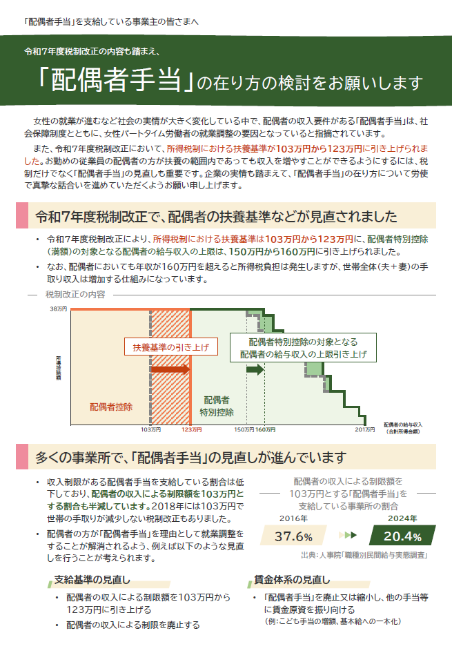 ▶(チラシ)令和7年度税制改正の内容も踏まえ、「配偶者手当」の在り方の検討をお願いします[335KB]