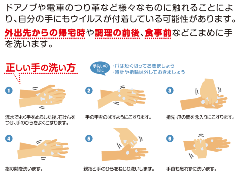 ドアノブや電車のつり革などさまざまなものに触れることにより、自分の手にもウイルスが付着している可能性があります。外出先からの帰宅時や調理の前後、食事前などこまめに手を洗いましょう。