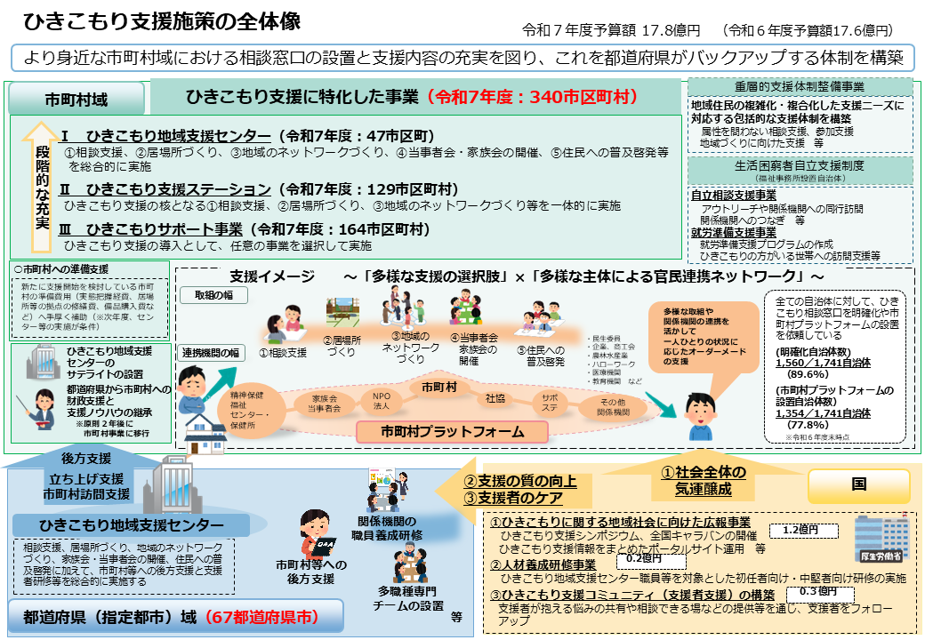 さらに、都道府県が市町村をバックアップする機能の強化として、市町村と連携した、ひきこもり地域支援センターのサテライト設置と小規模市町村等に対して財政支援と支援手法の継承を行う事業も創設し、都道府県の圏域内どこでも支援が受けられるよう平準化を図りながら、市町村のひきこもり支援体制の整備を促進していくこととしています。