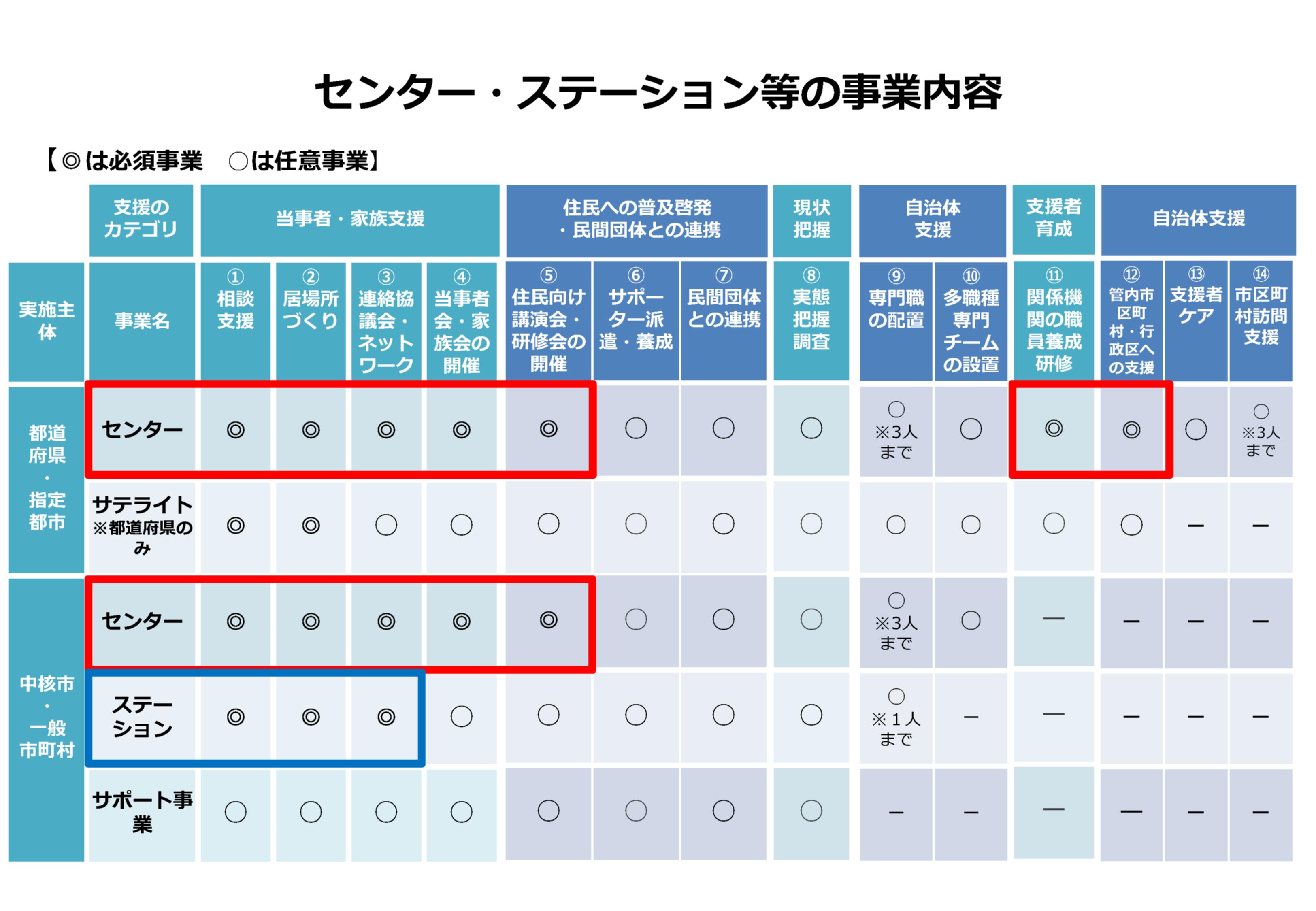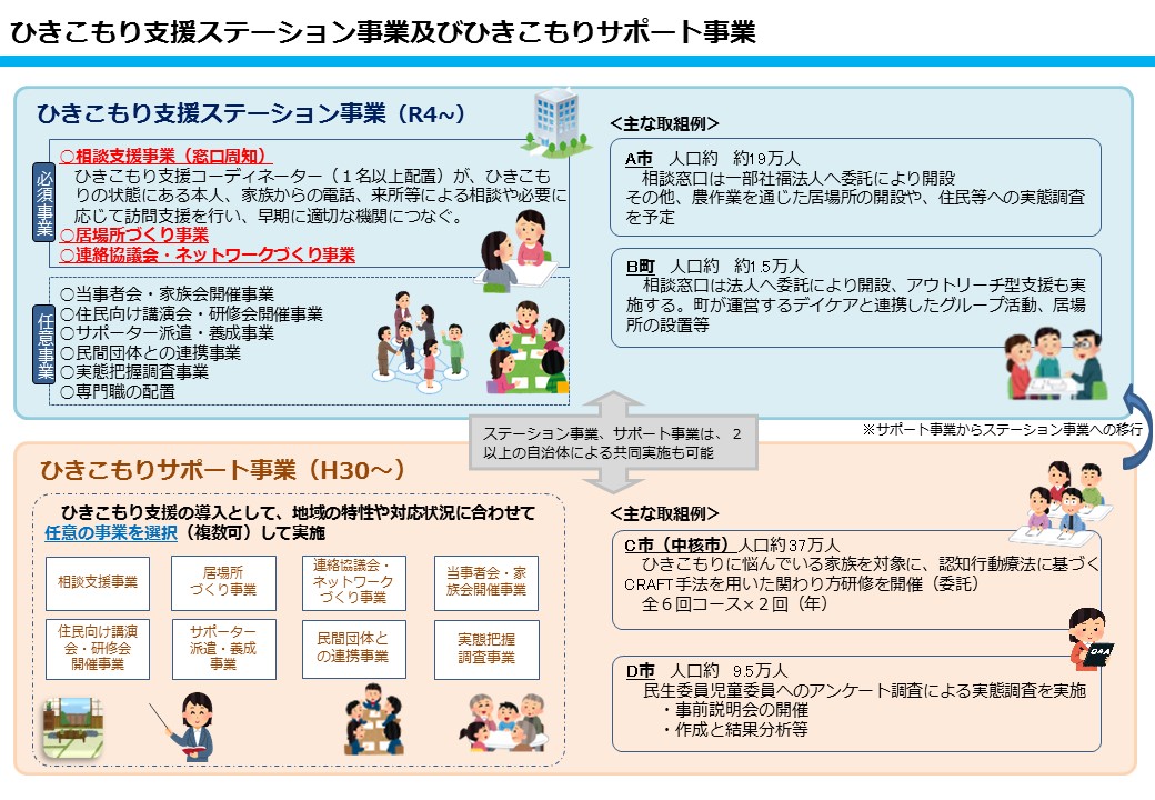 「ひきこもり支援ステーション事業」では、相談支援、居場所づくり、連絡協議会・ネットワークづくりを必須事業としており、さらに各市町村の実情に応じた個別の任意事業を実施する事業です。