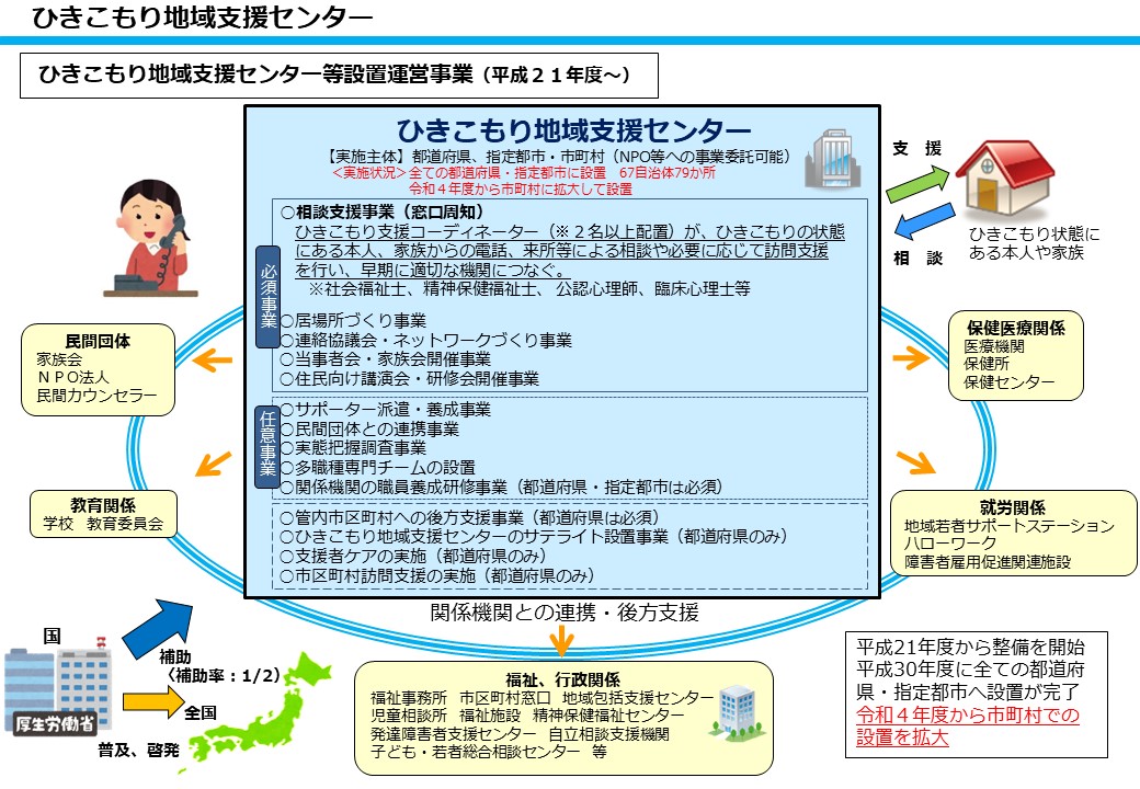 厚生労働省では、ひきこもり当事者やそのご家族が、より身近なところで相談ができ、必要な支援が受けられる環境づくりを目指して、市区町村における相談窓口の設置や居場所づくり、関係者間のネットワーク構築、当事者会・家族会の開催など、ひきこもり支援体制の構築を進めています。