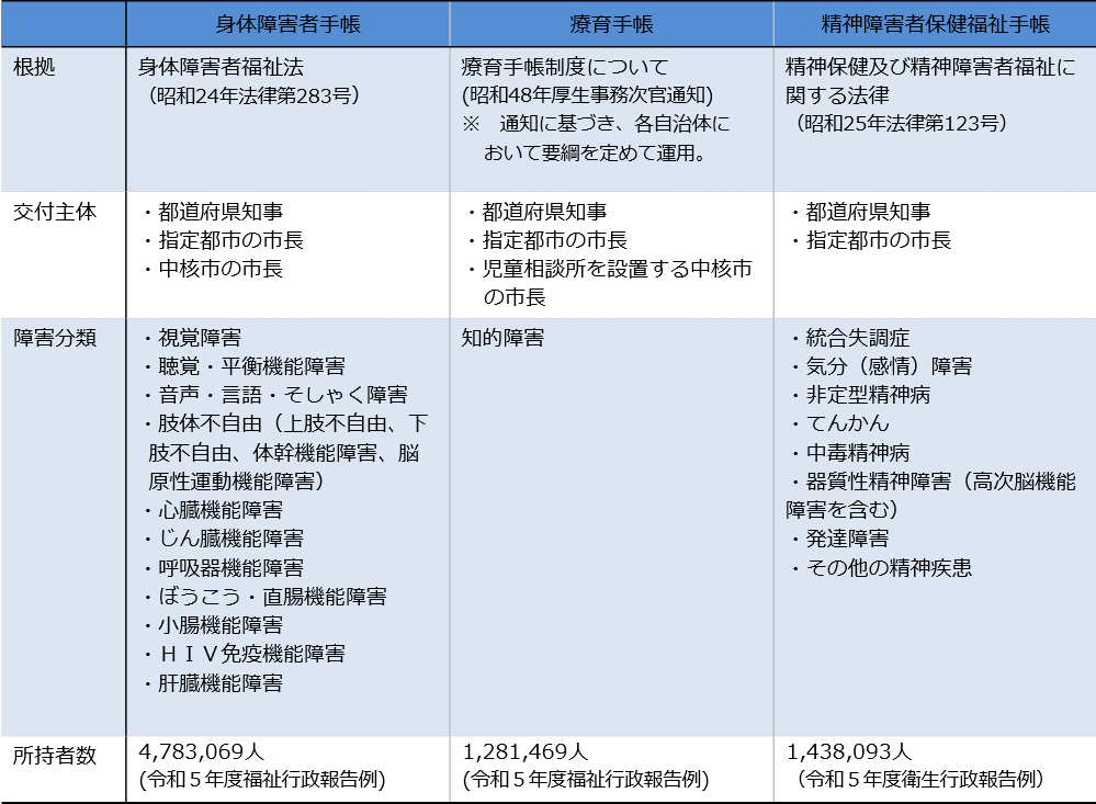 障害者手帳は、身体障害者手帳、療育手帳、精神障害者保健福祉手帳の3種の手帳を総称した一般的な呼称です。