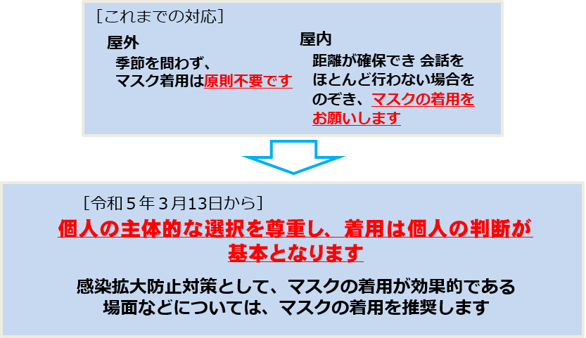 令和5年3月13日以降、マスクの着用は、個人の主体的な選択を尊重し、個人の判断が基本となりました。