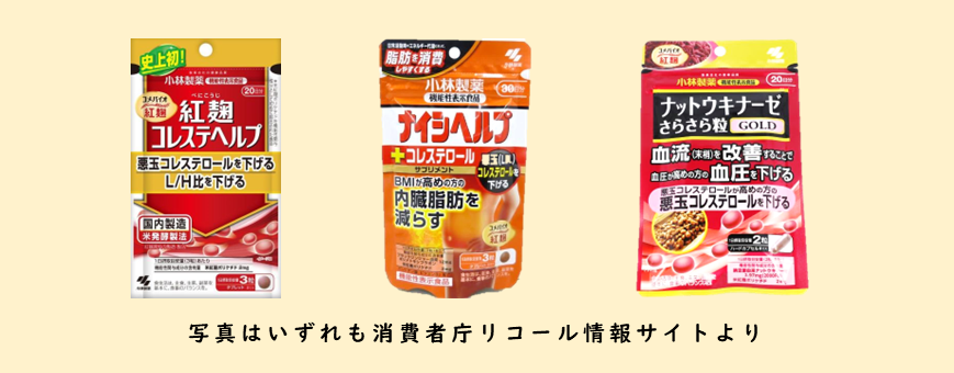 If you have any of the following three products manufactured and sold by Kobayashi Pharmaceutical Co., Ltd. which are subject to a disposal order, please stop cosuming them immediately. If you have any symptoms or feel abnormalities, please consult with a medical doctor or contact a local public health center nearby your residence.