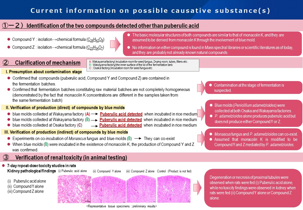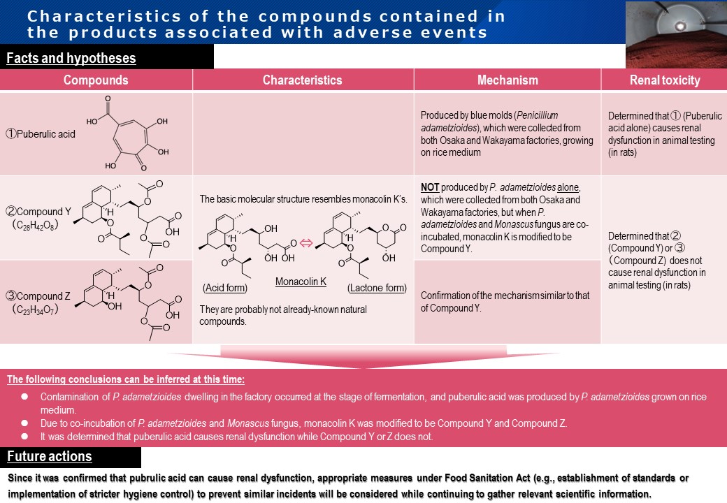 - Puberulic acid, an unintended compound found in some Beni-koji raw materials used in the products that have been reported to be associated with adverse events, was produced by a certain blue mold (Penicillium adametzioides), and this blue mold was also involved in the production of two other compounds (Y and Z)
