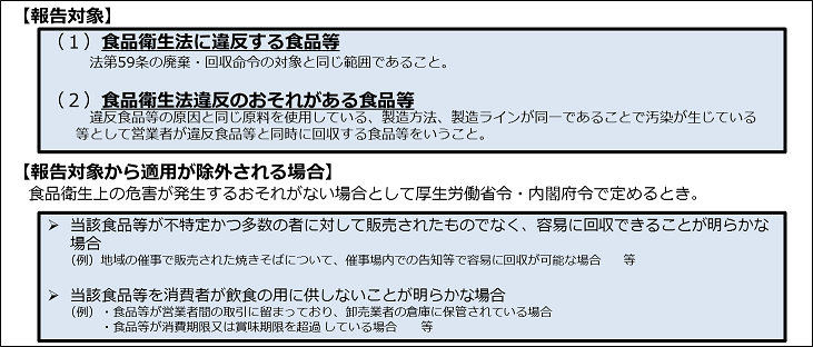 事業者による食品等のリコール情報を行政が確実に把握し、的確な監視指導や消費者への情報提供につなげ、食品による健康被害の発生を防止するため、事業者がリコールを行う場合に行政への届出を義務づけました。