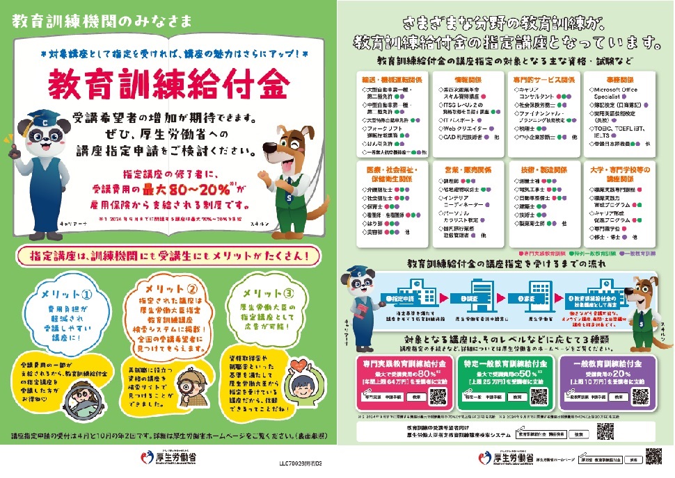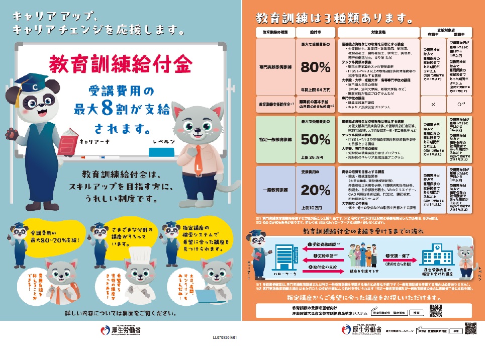 受講者の方に教育訓練給付金について案内する際は、以下のリーフレットを御活用ください。