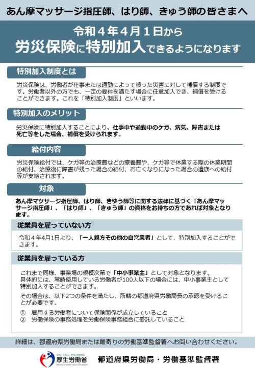 令和4年4月1日からは、あん摩マッサージ指圧師、はり師、きゅう師も、特別加入の対象となりました。