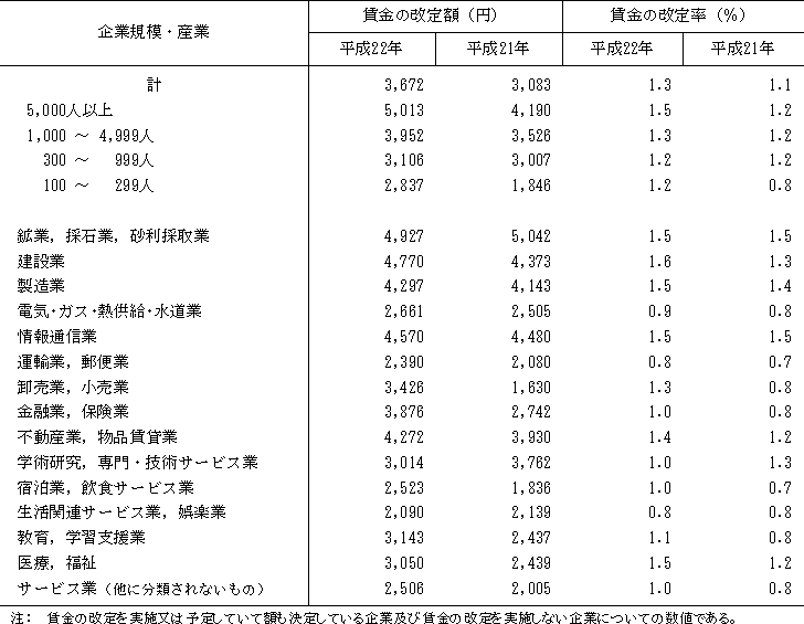 平成22年中における賃金の改定状況(9〜12月予定を含む)は、1人平均賃金の改定額(以下、平均値については常用労働者数による加重平均である。)が3,672円(前年 3,083円)、1人平均賃金の改定率が1.3%(同 1.1%)となっている。1人平均賃金の改定額、改定率ともに昨年を上回っている。