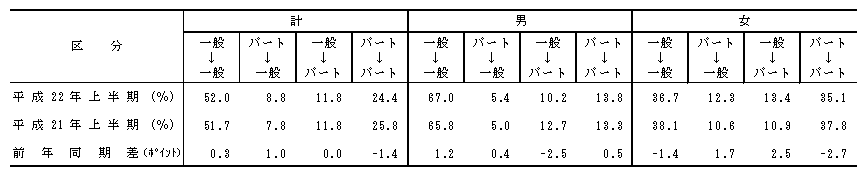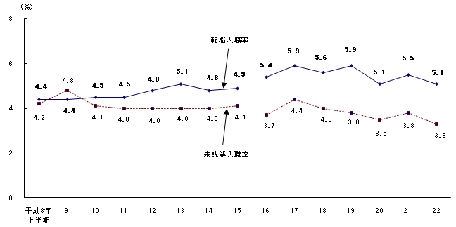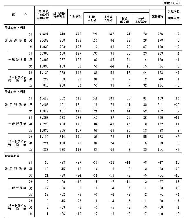 平成22年上半期(1月〜6月)における労働移動者は、入職者が373万人(前年同期410万人)、離職者が376万人(同423万人)で、延べ労働移動者は749万人(同832万人)となり、入職者のうち転職入職者は226万人(同241万人)となっている。これを率でみると、入職率は8.4%(同9.3%)、離職率は8.5%(同9.6%)となっている。
