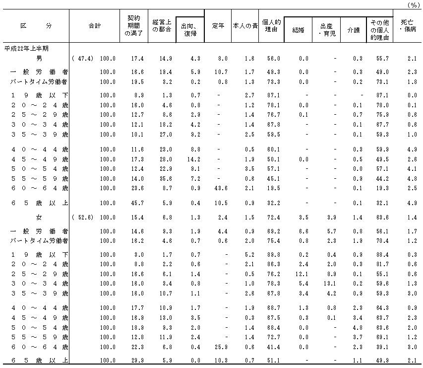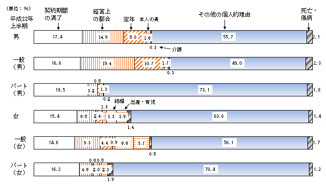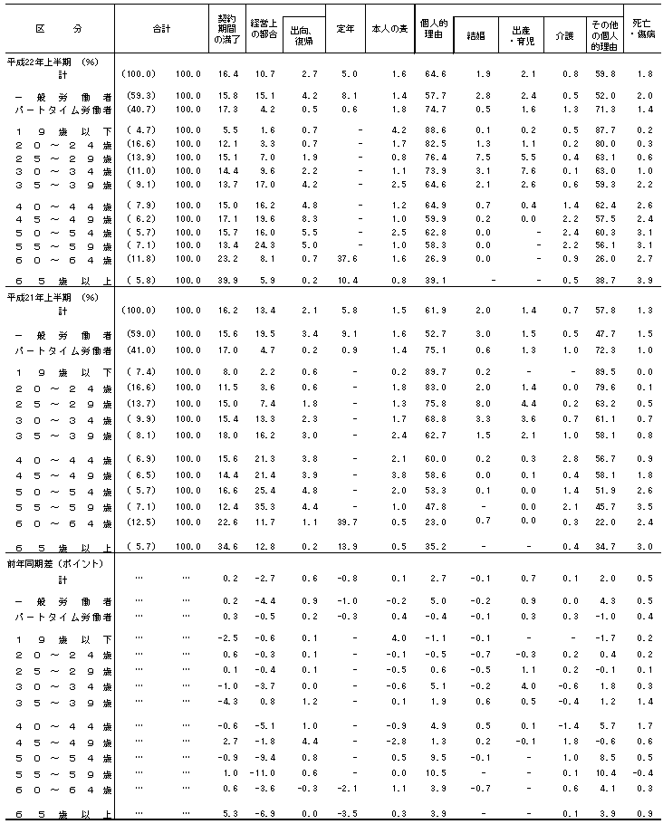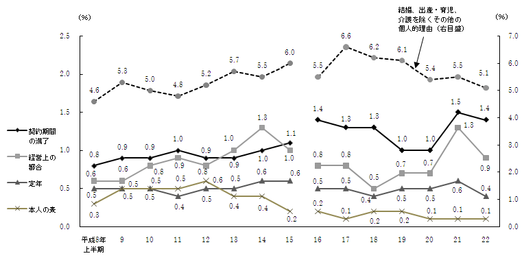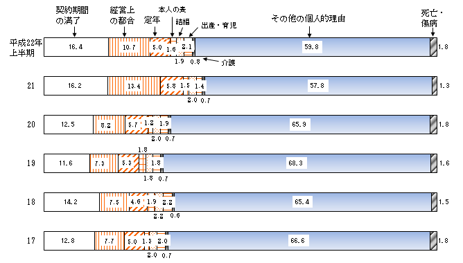 各年上半期の離職理由の推移を見ると、「契約期間の満了」は平成17年から20年は11〜14%であるが、平成21年16.2%、平成22年16.4%と増加し、「経営上の都合」は平成17年から20年の7〜8%に比べ、平成21年は13.4%と増加し、平成22年は10.7%と21年より低下したが20年を上回っている。