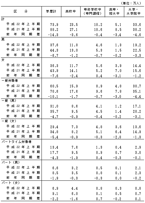 前年同期差をみると、一般労働者はすべての学歴で減少、パートタイム労働者は専修学校(専門課程)卒を除き減少し、一般労働者は10.1万人の減少、パートタイム労働者は4.3万人の減少となっている。(表1)