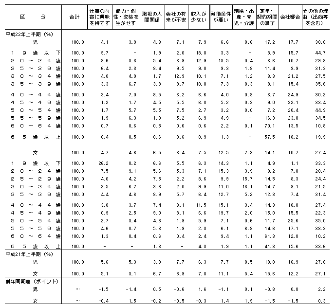 前年同期と比べると、「その他の理由」以外で、男では、「収入が少ない」が1.6ポイント上昇し、「仕事の内容に興味を持てず」が1.5ポイント低下、女では、「結婚・出産・育児・介護」が1.9ポイント上昇し、「定年・契約期間の満了」及び「会社都合」が1.5ポイント低下している。(表3)