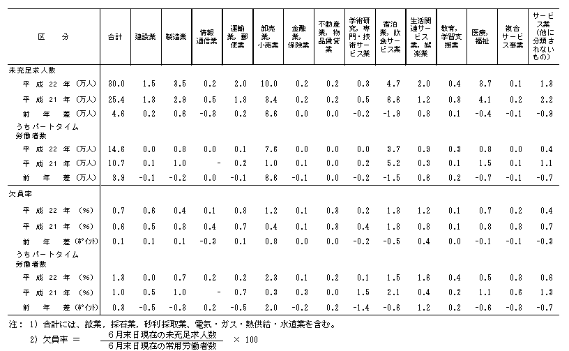 平成22年6月末日現在の未充足求人数は30.0万人(前年25.4万人)と前年より4.6万人増加し、欠員率(在籍労働者に対する未充足求人数の割合)は0.7%(同0.6%)となっている。また、未充足求人数のうちパートタイム労働者は14.6万人(同10.7万人)で、欠員率は1.3%(同1.0%)となっている。(図9、表5)