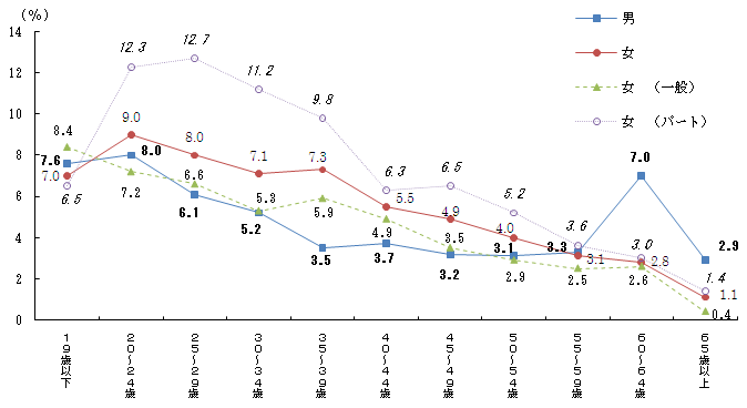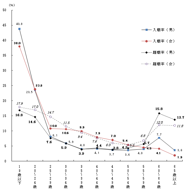 年齢階級別に転職入職率をみると、男は25〜29歳から55〜59歳にかけておおむね年齢階級とともに低くなっているが、60〜64歳で高くなっている。女は20〜24歳から50〜54歳で男より割合が高いがおおむね年齢階級とともに低くなっている。