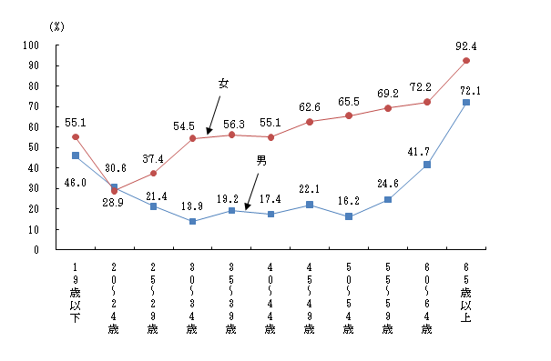 (男は20〜24歳以下と60〜64歳で高く、女は35〜39歳以下で高い)