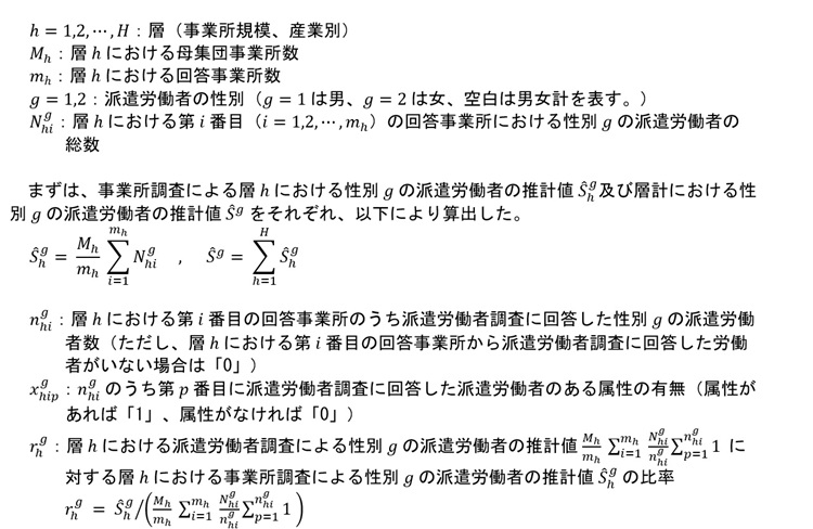 派遣労働者調査は、事業所調査に回答のあった事業所を第1次抽出単位、当該事業所において就業している派遣労働者を第2次抽出単位とする二段無作為抽出であるため、「ある属性を有する派遣労働者の割合」の推計値については、以下のとおり算出した。