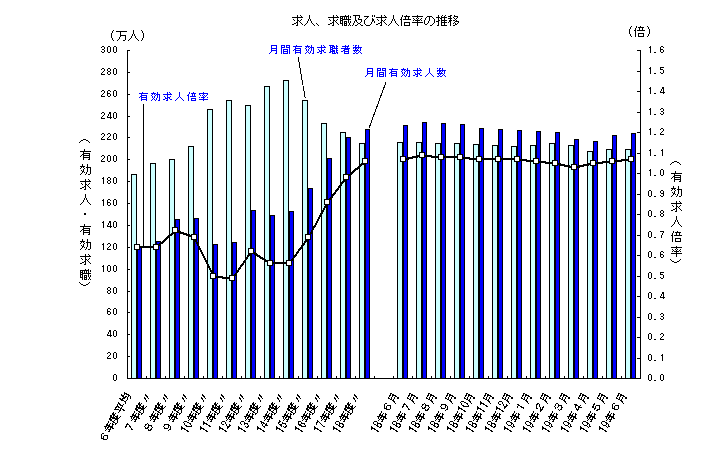 平成19年6月の一般職業紹介状況をみると、有効求人倍率(季節調整値)は1.07倍となり、前月を0.01ポイント上回った。正社員有効求人倍率は0.57倍となり、前年同月を0.01ポイント下回った。