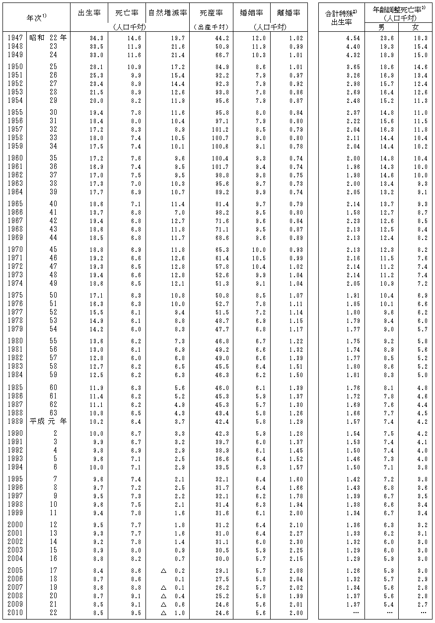 2)出生・死亡・自然増減・婚姻・離婚率は人口千対、死産率は出産(出生+死産)千対である。