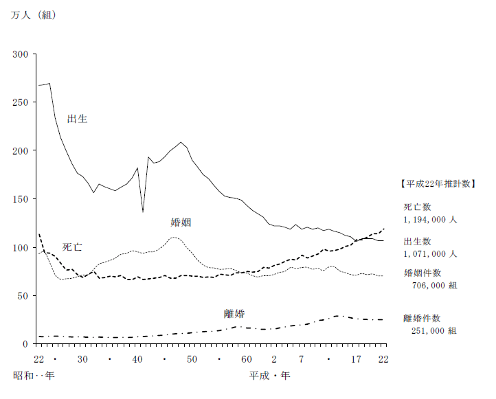 注:昭和47年以前は沖縄県を含まない。平成21年までは確定数、平成22年は推計数である。