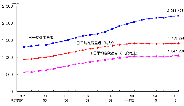 平成8年の1日平均在院患者数は1,403,294人で前年に比べ6,142人(0.4%)増加している。1日平均新入院患者数は32,153人で538人(1.7%)、1日平均退院患者数は32,119人で522人(1.7%)、1日平均外来患者数は2,214,476人で23,958人(1.1%)と前年に比べそれぞれ増加している。