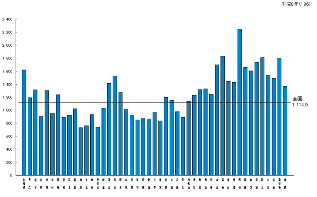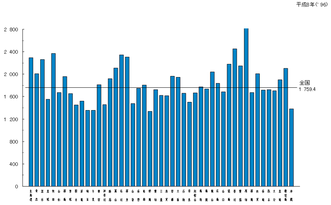 都道府県別にみると、高知県(2,842.1)が最も多く、次いで香川県(2,450.6)、秋田県(2,369.7)となっており、静岡県(1,333.7)、埼玉県(1,355.0) 、千葉県(1,355.0)などが少なくなっている。